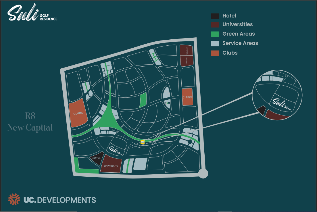 حرصت الشركة العقارية المطورة لمشروع كمبوند سولي جولف ريزيدنس Suli Golf Residence أن تضع موقع مشروعها الجديد نصب عينيها؛ لما له من أهمية كبيرة لدى المستثمرين وراغبي الحصول على وحدات سكنية قريبة من الخدمات والمناطق الحيوية في العاصمة؛ لذلك وقع الاختيار على الحي الثامن أو منطقة R8 التي تقترب من المناطق التالية:
